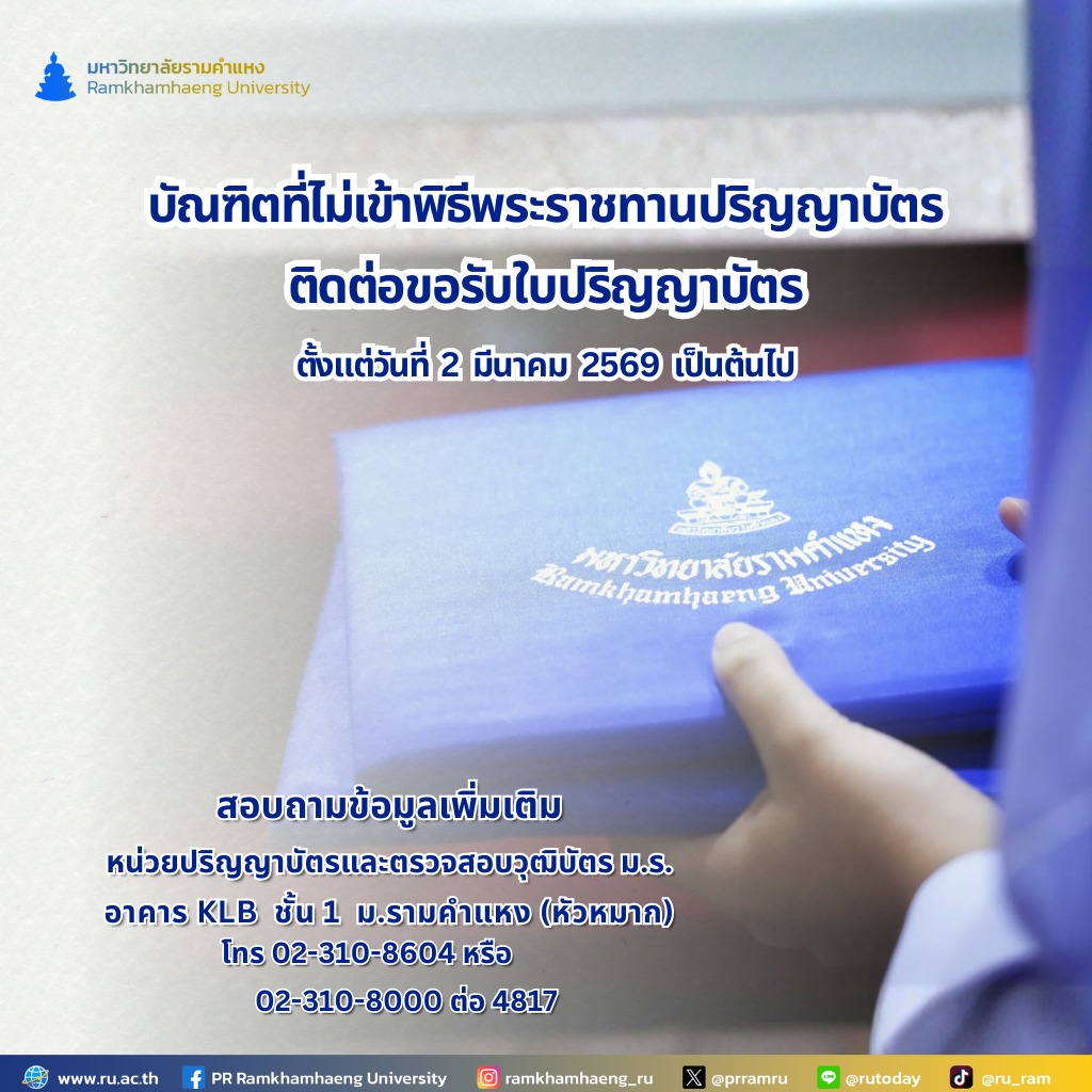 มหาวิทยาลัยรามคำแหง แจ้งขั้นตอนการติดต่อขอรับปริญญาบัตร สำหรับบัณฑิตระดับปริญญาตรีที่ไม่เข้าพิธีพระราชทานปริญญาบัตรประชาสัมพันธ์18 กุมภาพันธ์ 2026