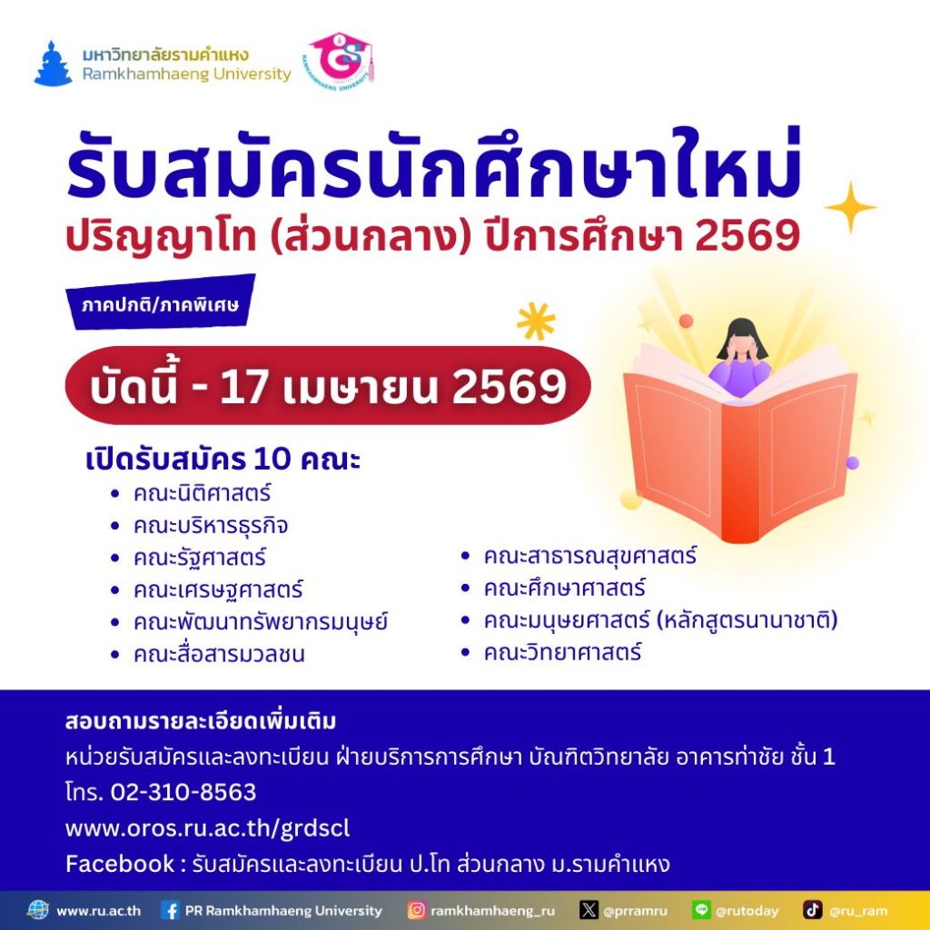 สอบถามหน่วยรับสมัครและลงทะเบียน บัณฑิตวิทยาลัย โทร. 02-310-8563 Facebook: รับสมัครและลงทะเบียน ป.โท ส่วนกลาง ม.รามคำแหง