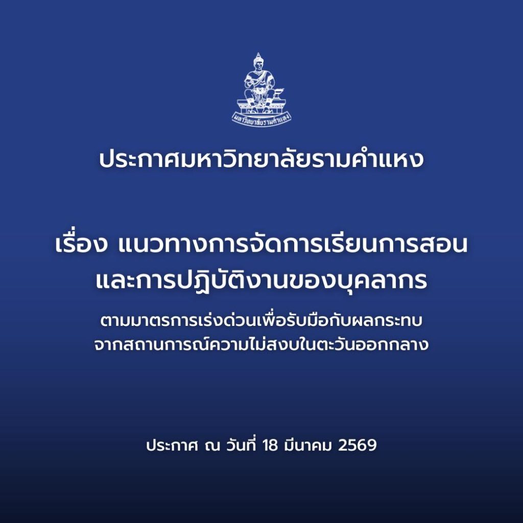 ประกาศ มหาวิทยาลัยรามคำแหง เรื่อง แนวทางการจัดการเรียนการสอนและการปฏิบัติงานของบุคลากร ตามมาตรการเร่งด่วนเพื่อรับมือกับผลกระทบจากสถานการณ์ความไม่สงบในตะวันออกกลาง ณ วันที่ 18 มีนาคม 2569